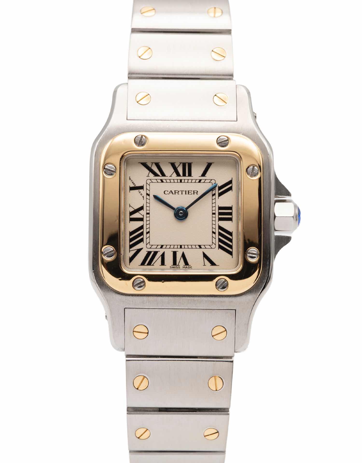 Discover the Cartier Santos, where innovation meets timeless style. Crafted in two tone yellow gold, its ivory dial adds flair and functionality. With a 24mm case, it effortlessly balances modern design and classic charm.