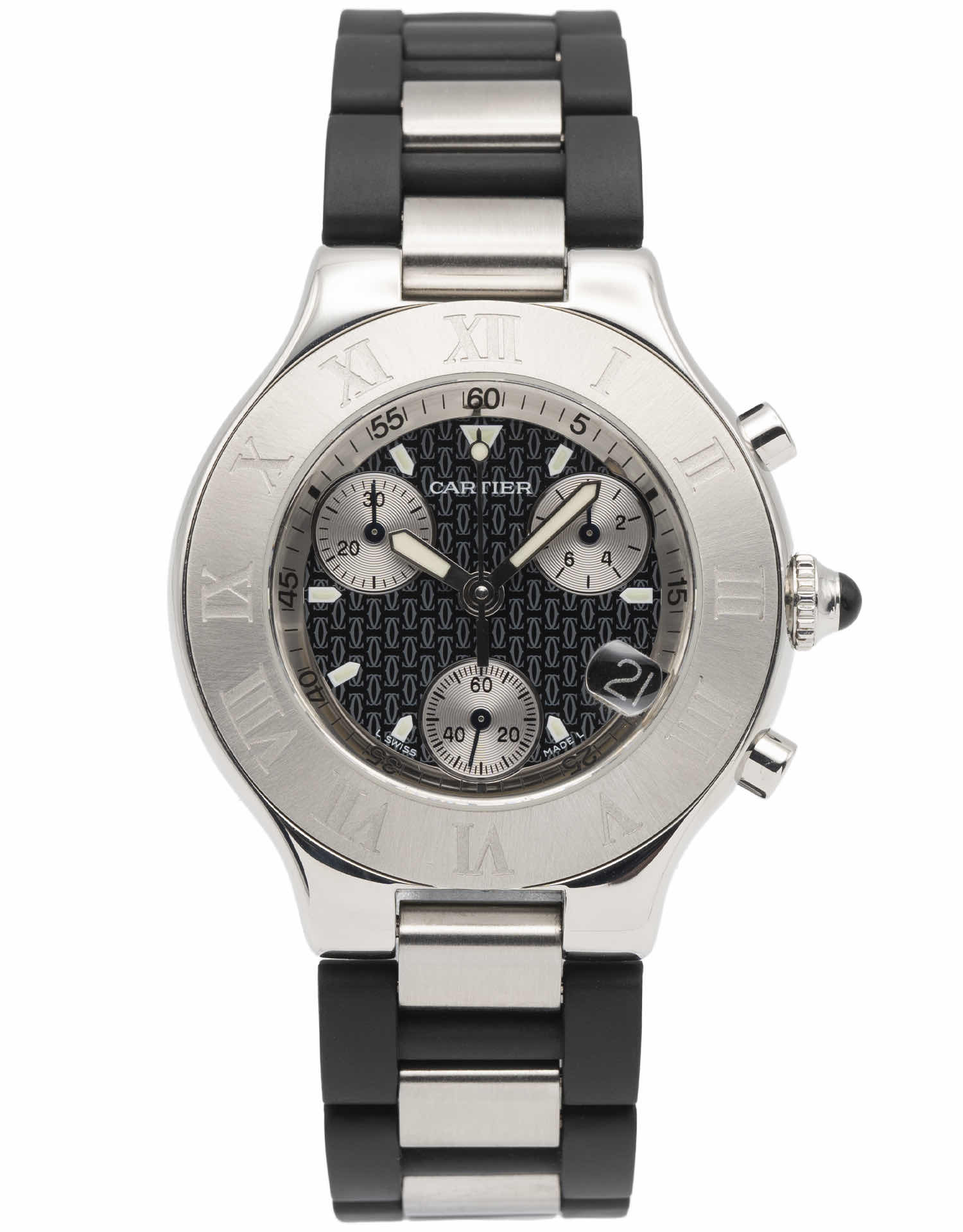 Discover the Cartier Sport 21, where innovation meets timeless style. Crafted in stainless steel, its black dial adds flair and functionality. With a 38mm case, it effortlessly balances modern design and classic charm.