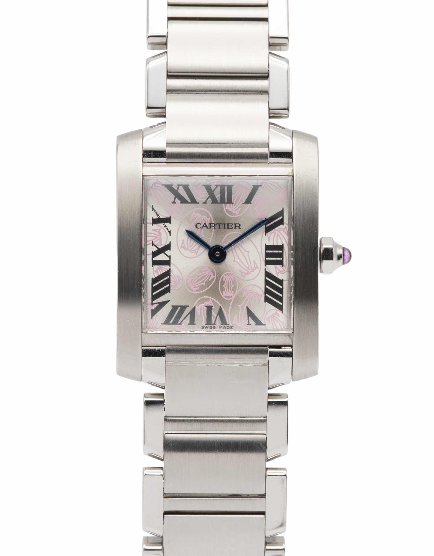 Discover the Cartier Tank, where innovation meets timeless style. Crafted in stainless steel, its pink dial adds flair and functionality. With a perfectly sized case, it effortlessly balances modern design and classic charm.