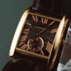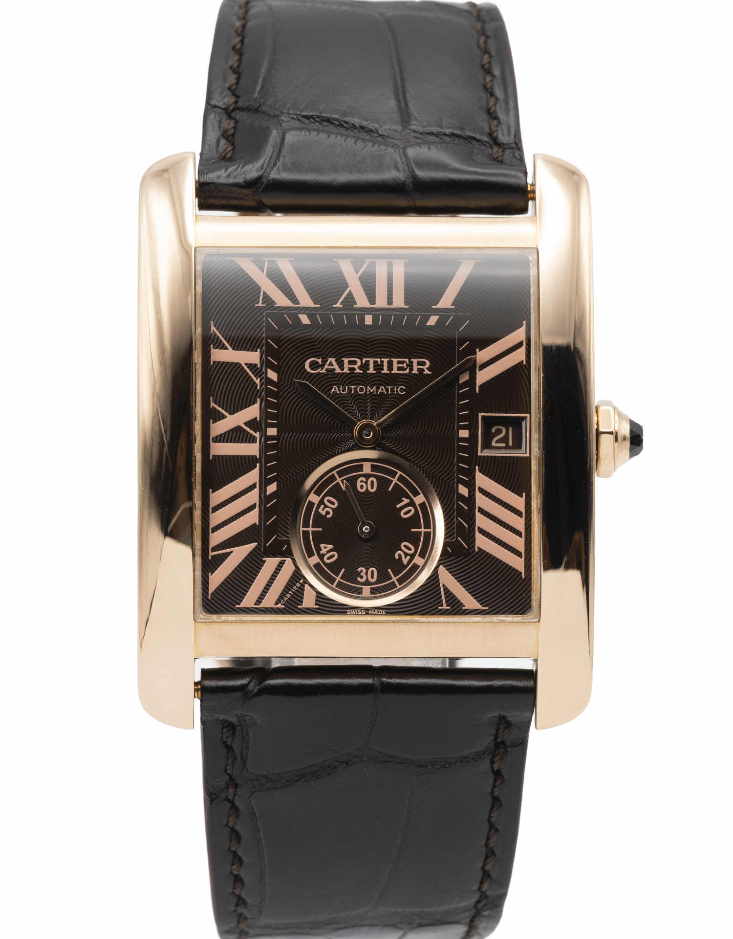 Discover the Cartier Tank, where innovation meets timeless style. Crafted in rose gold, its chocolate chronograph dial adds flair and functionality. With a 44mm case, it effortlessly balances modern design and classic charm.