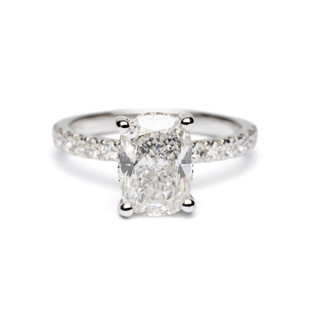 Platinum 2ct Lab Grown Cushion Cut Diamond Ring With Diamond Set Shoulders & Hidden Halo