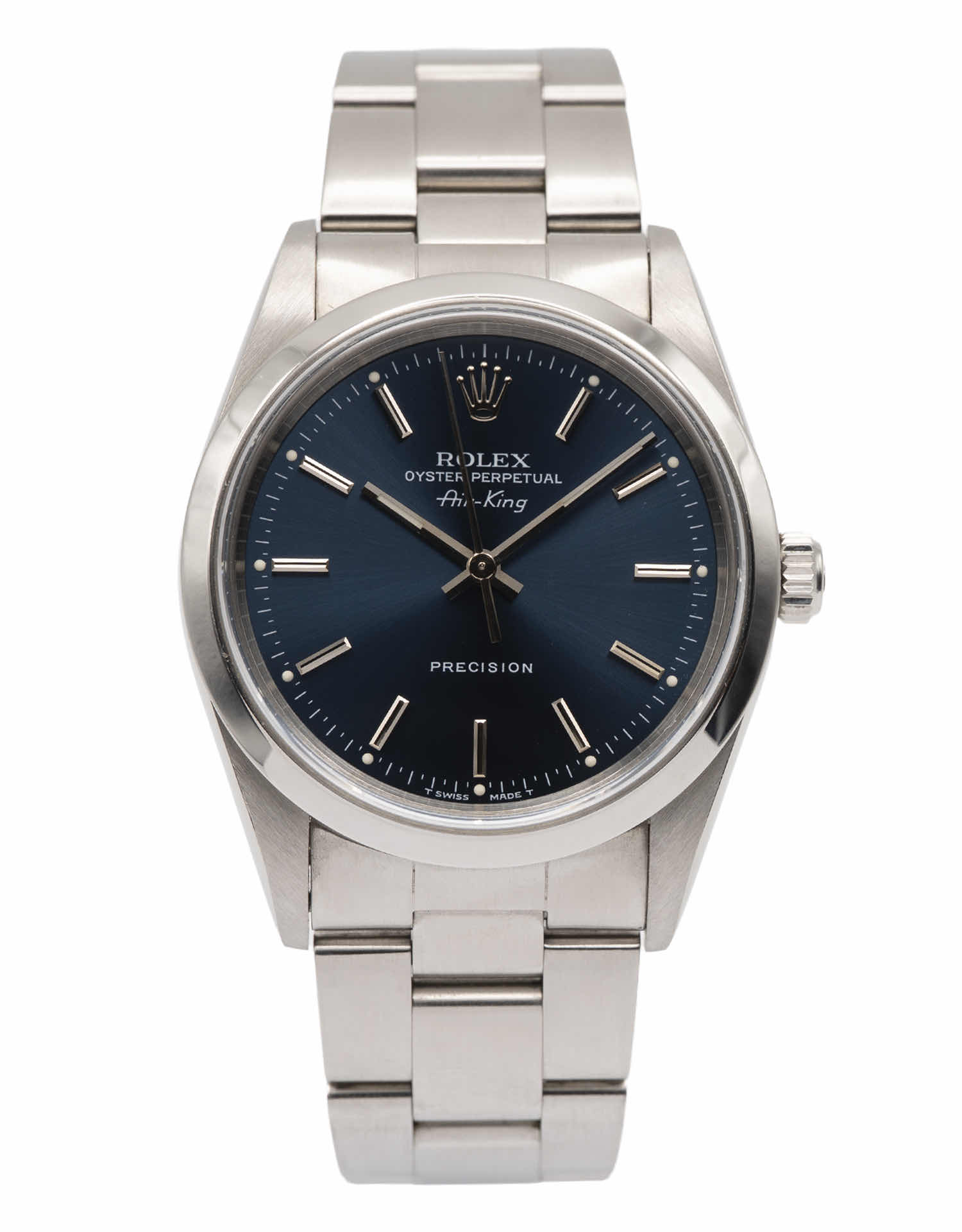 Discover the Rolex Air-King (1998), where innovation meets timeless style. Crafted in steel, its blue dial adds flair and functionality. With a 34mm case, it effortlessly balances modern design and classic charm.