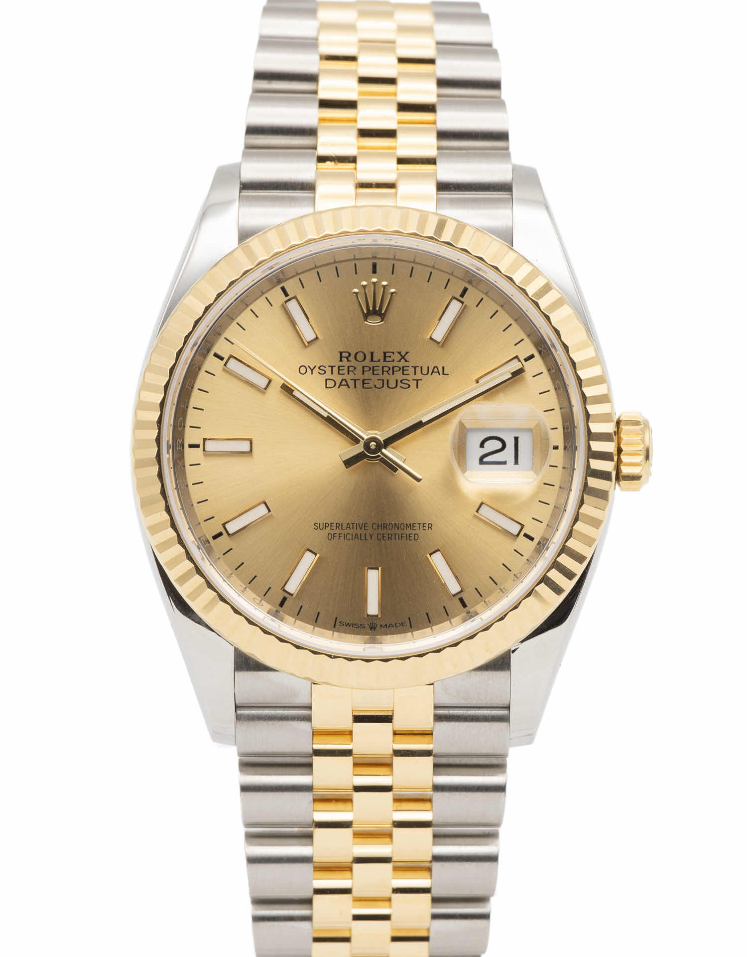 Discover the Rolex Datejust 36 (2019), where innovation meets timeless style. Crafted in two tone yellow gold, its sleek dial adds flair and functionality. With a 36mm case, it effortlessly balances modern design and classic charm.