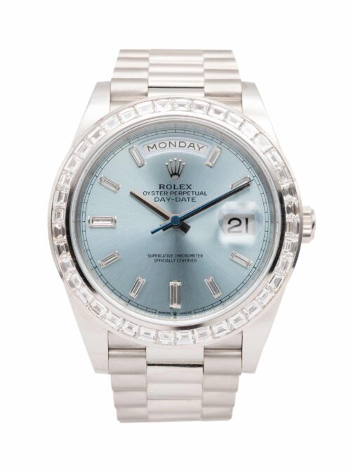Discover the Rolex Day-Date 40Mm (2017), where innovation meets timeless style. Crafted in platinum, its ice blue dial adds flair and functionality. With a 40Mm case, it effortlessly balances modern design and classic charm.