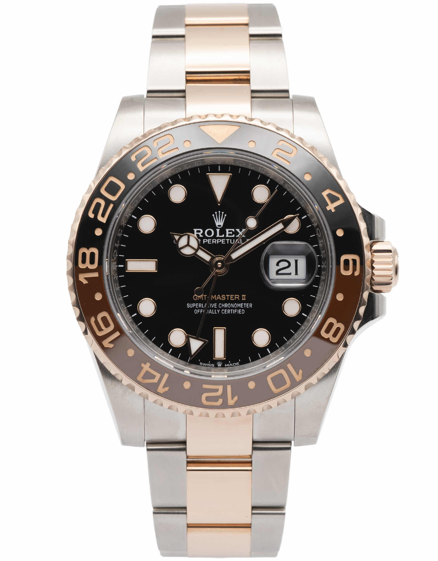 Discover the Rolex GMT-Master II (2021), where innovation meets timeless style. Crafted in two tone rose gold, its black dial adds flair and functionality. With a 40MM case, it effortlessly balances modern design and classic charm.