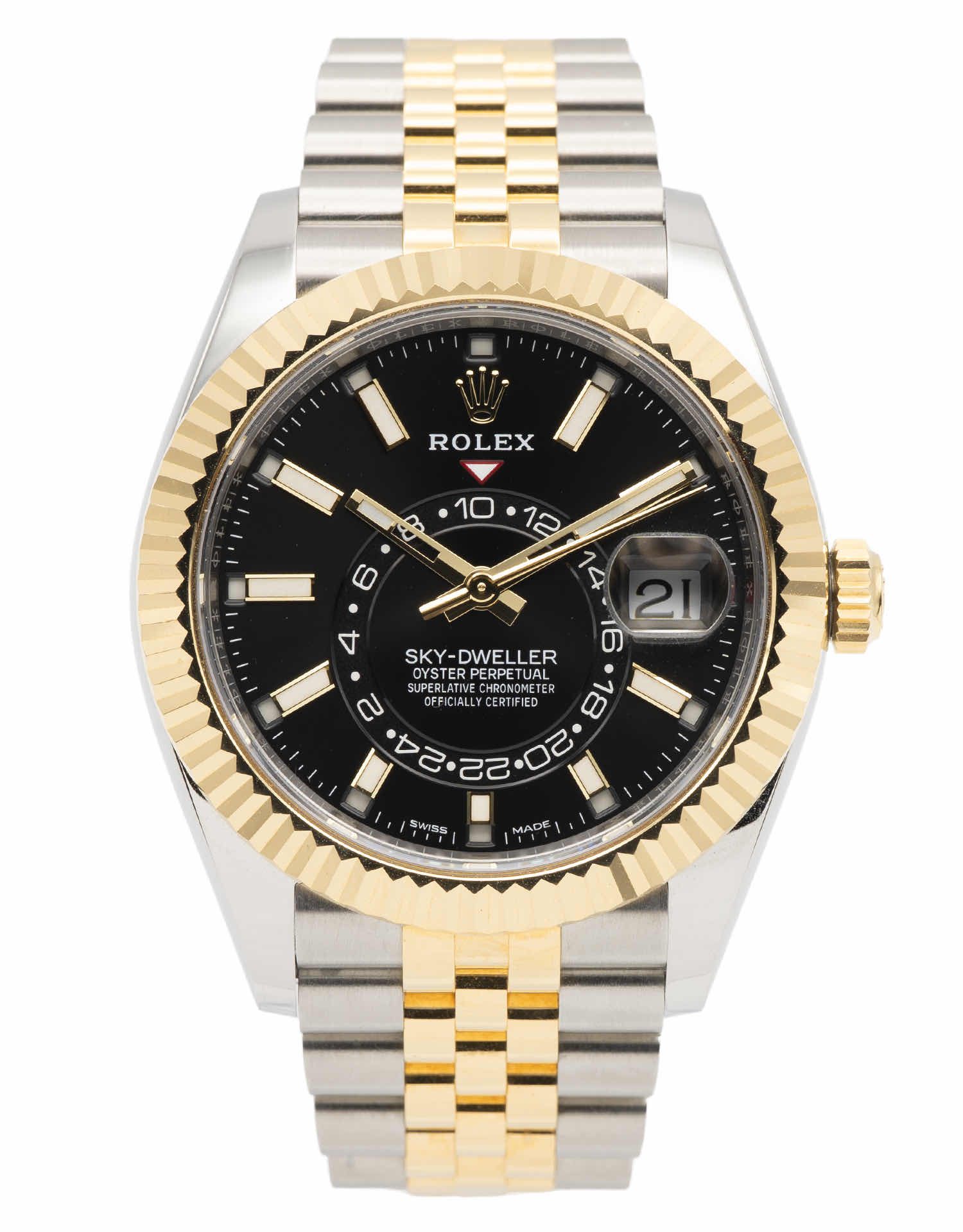 Discover the Rolex Sky-Dweller (2022), where innovation meets timeless style. Crafted in two tone yellow gold, its black dial adds flair and functionality. With a 42mm case, it effortlessly balances modern design and classic charm.