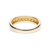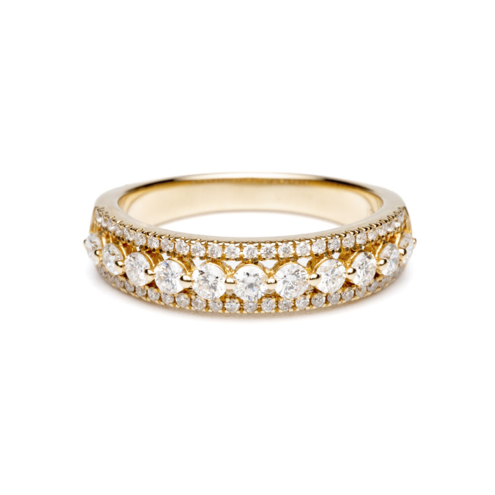The brilliant-round diamonds are set halfway around the band, creating a continuous sparkle that catches the light from every angle. The warm glow of the yellow gold band complements the diamonds’ fire and brilliance, offering a classic yet refined look.