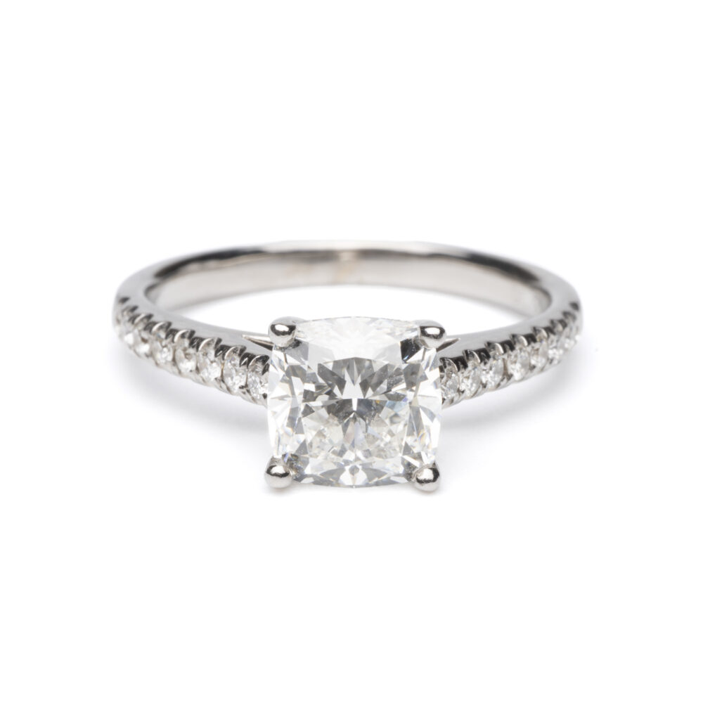 18ct White Gold Cushion Cut Diamond Ring With Diamond Set Shoulders