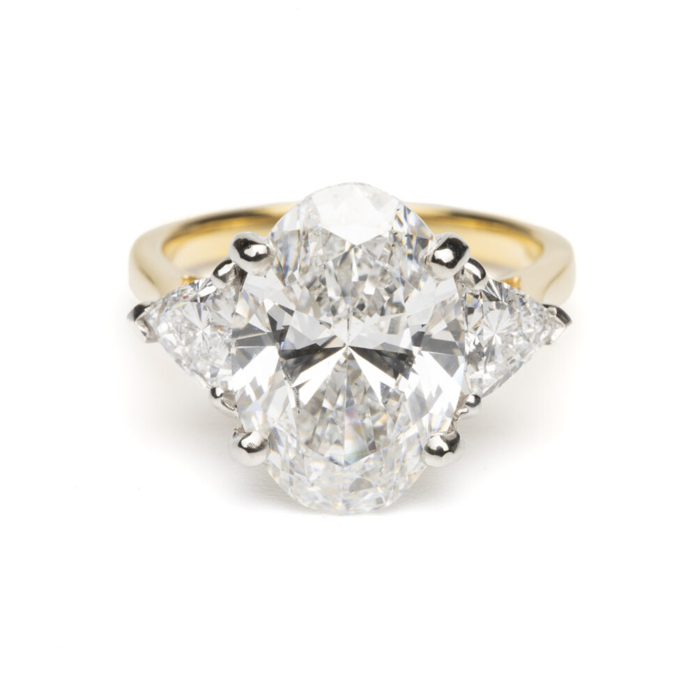 18CT Yellow / Platinum Lab Grown 5CT Oval Diamond Ring With Lab Grown Trillions Each Side 0.79CT