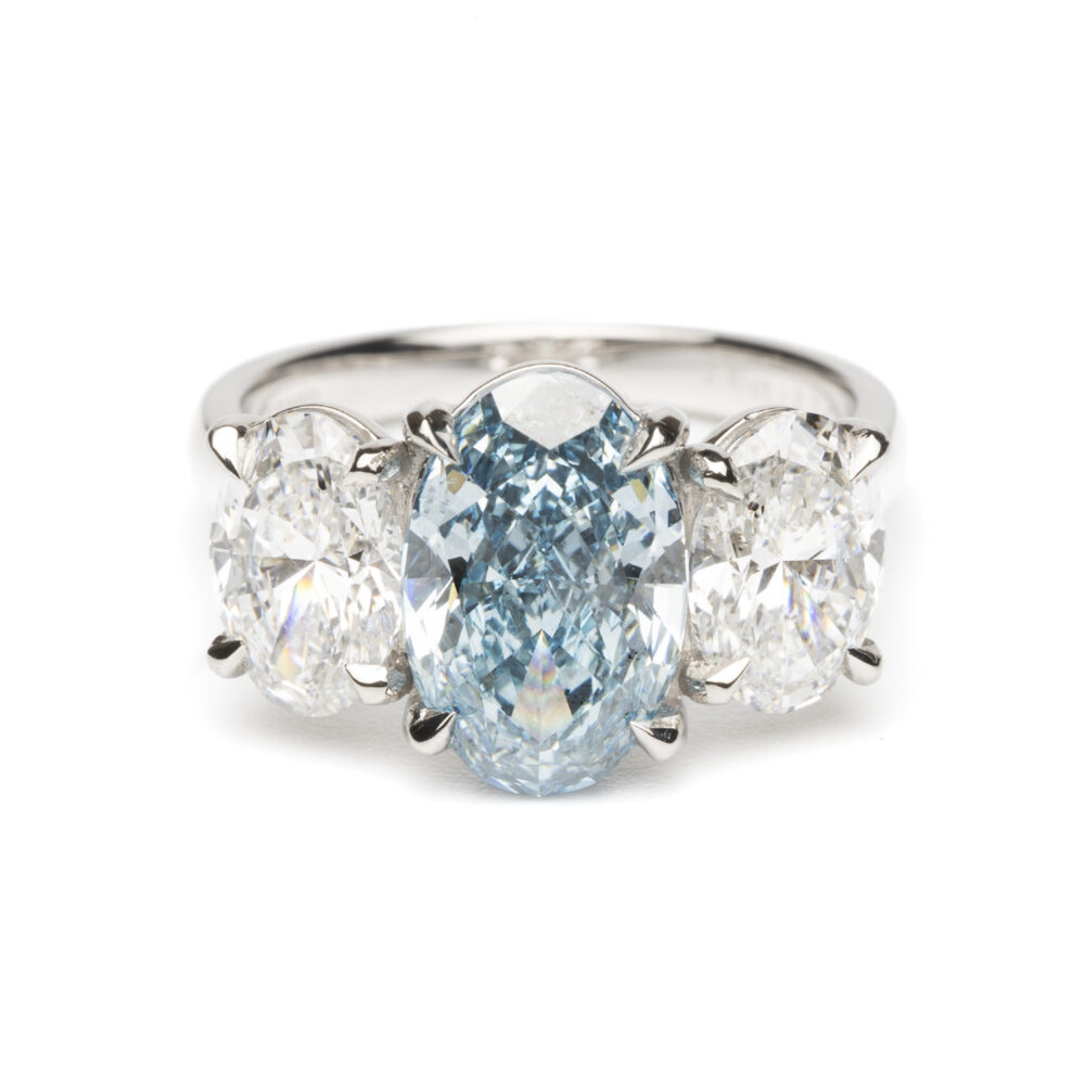 A breathtaking statement of modern luxury, this platinum three-stone ring features a magnificent 2.61-carat lab-grown oval-cut diamond in a rare Fancy Vivid Blue colour. Flanked by two matching oval-cut shoulder stones totalling 2.01 carats, this design radiates balance, brilliance, and sophistication from every angle.