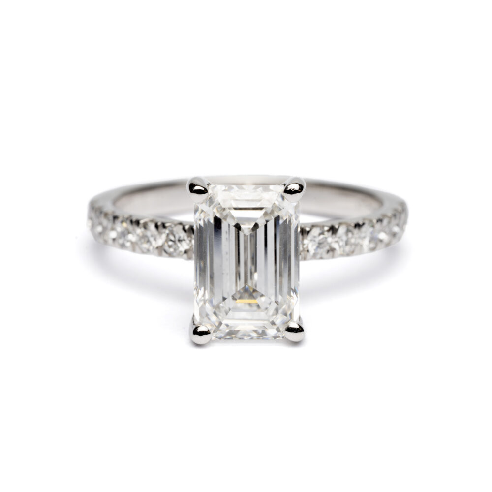 A celebration of refined elegance and modern brilliance, this platinum diamond ring features a stunning lab-grown emerald cut diamond of approximately 2.00ct at its centre. With its sleek lines and captivating clarity, the emerald cut showcases an understated yet striking sophistication — beautifully complemented by the cool lustre of the platinum setting.