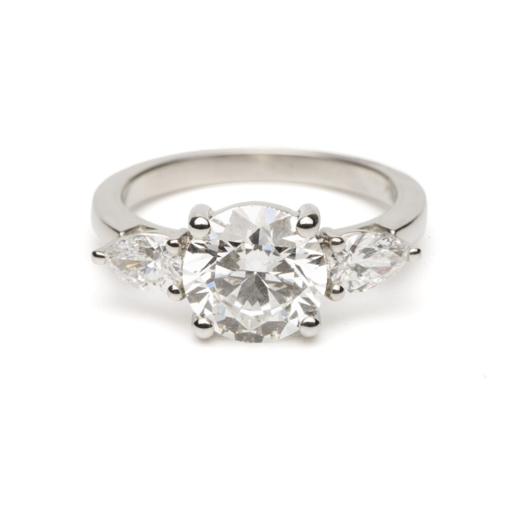 – Setting: Three-stone with pear-shaped shoulders