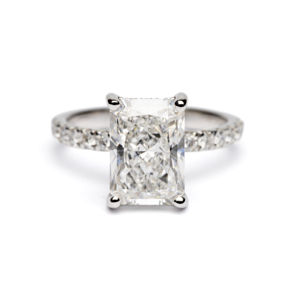 – Centre Stone: Lab-grown radiant cut diamond, 3.03 ct