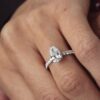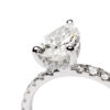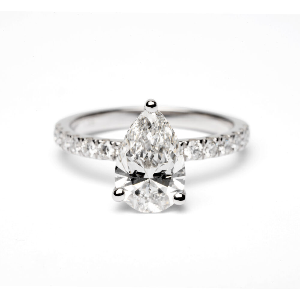 The shoulders of the band are adorned with diamond-set accents, which continue the sparkle along the shank and frame the main diamond beautifully. These accent stones add extra brilliance and elevate the design’s luxurious feel without overpowering the elegant shape of the pear cut.