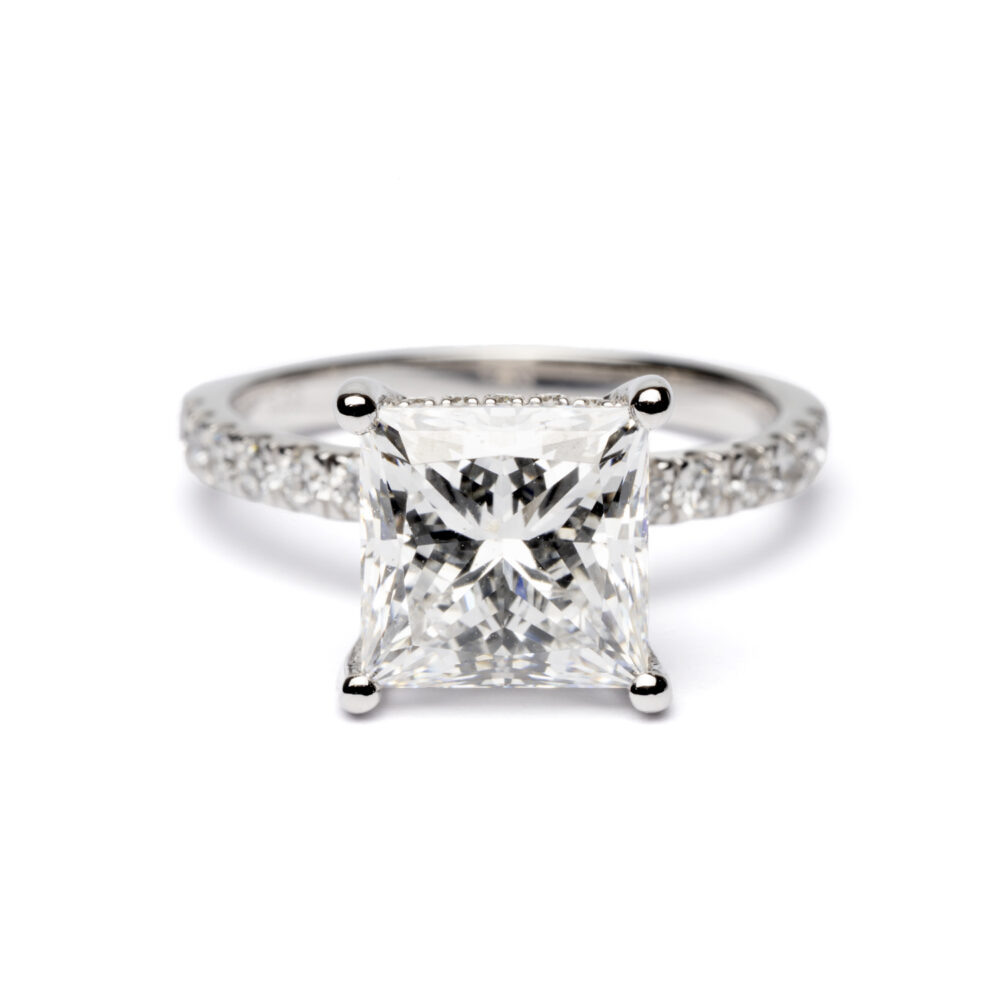 • Center Stone: 3.00ct lab-grown princess cut diamond — brilliant, contemporary and ethically sourced.