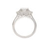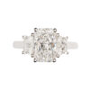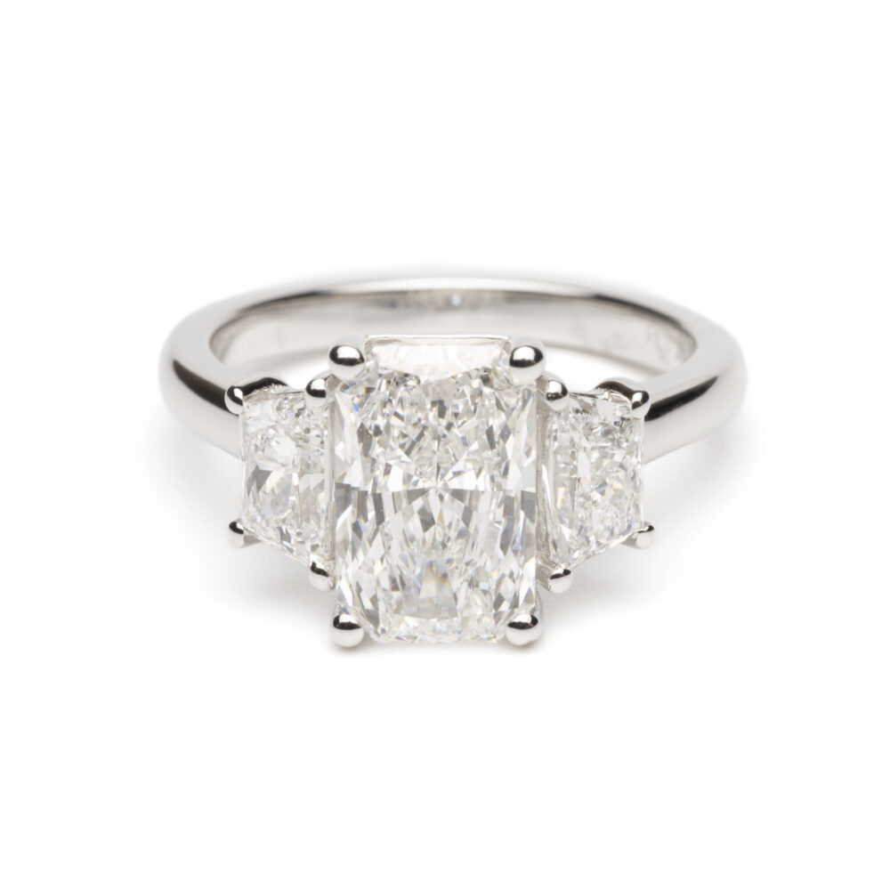 A contemporary masterpiece, this platinum ring showcases a stunning 2.51-carat lab-grown radiant-cut diamond, elegantly framed by trapezoid-cut side stones totalling 0.95 carats. The combination of cuts creates a striking geometric silhouette, delivering exceptional brilliance and balance from every angle.