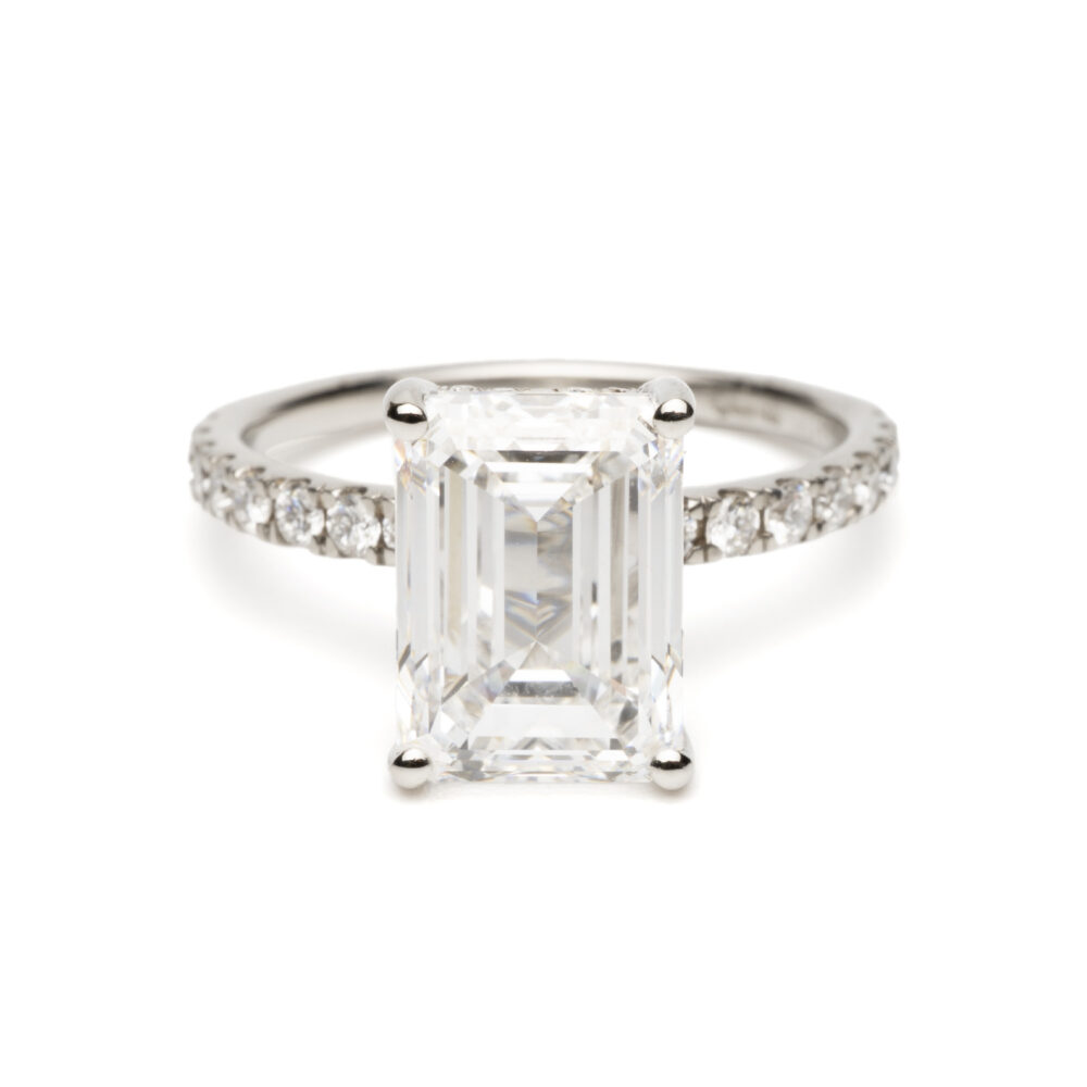 A timeless and sophisticated design, this platinum ring showcases a stunning lab-grown emerald-cut diamond at its centre, enhanced by elegant diamond-set shoulders that add subtle sparkle and refinement. The emerald cut’s clean lines and mirror-like facets exude understated brilliance and classic allure.