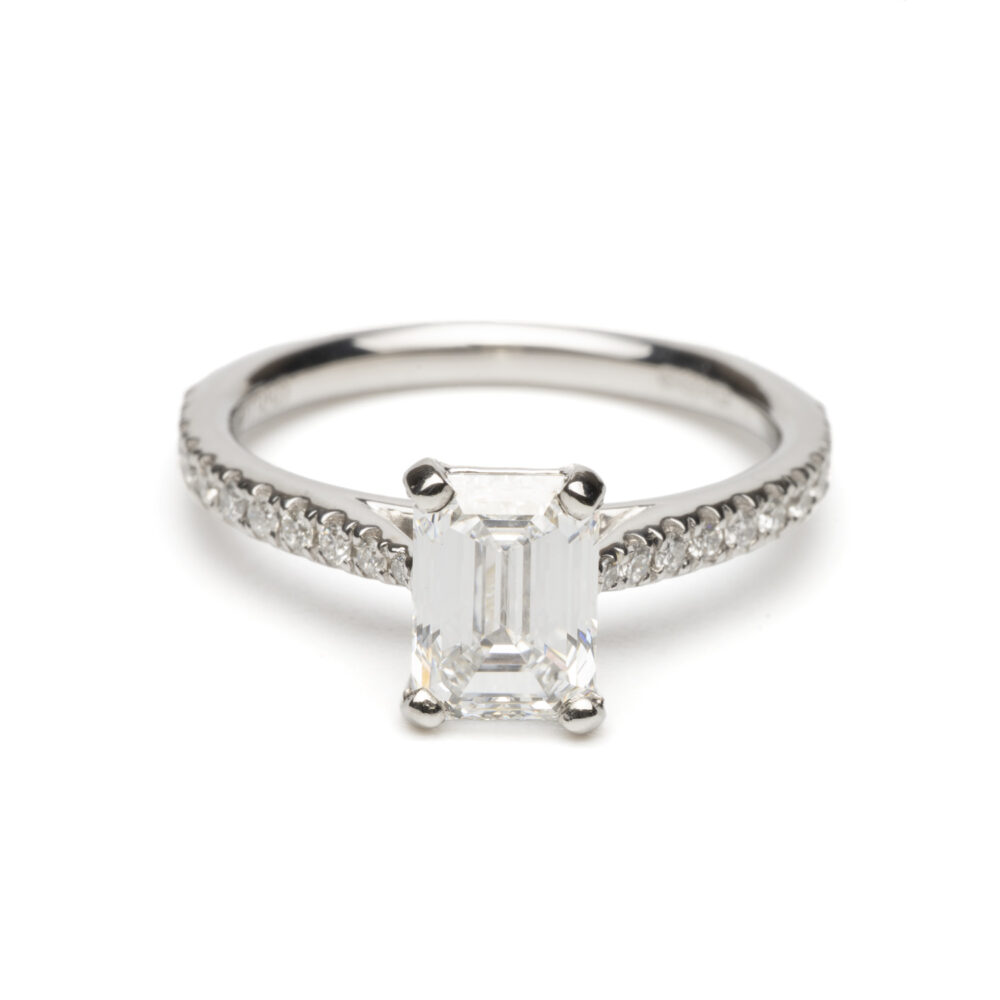 Platinum Single Stone Lab Grown Emerald Cut Diamond Ring With Diamond Set Shoulders