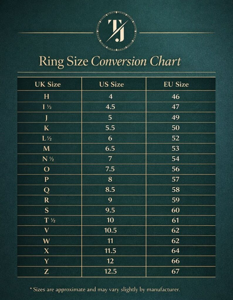 While conversion charts are useful as a guide, it is important to understand that ring size conversions are approximate rather than exact. Differences in band width, ring profile and manufacturing tolerances mean that a converted size may not feel identical across regions. For this reason, UK sizing should always be used when purchasing from a UK jeweller.