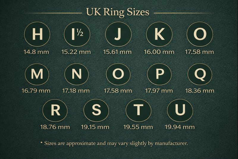 Ring sizes in the UK are measured using a letter-based system, starting from A and increasing in small increments. Each letter corresponds to a precise internal circumference of the ring.